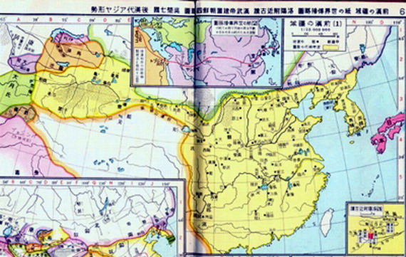 最近在旧书摊上买到一本地图册(见封面),是日本人在1939年前后出版的中学教科书。该图册绘制出了中国从春秋战国到中华民国的各个时期的疆域版图和面积,甚至还标出了外国军队与中国军队相互对峙和进退的路线,这在其他地图中是很少见的。
